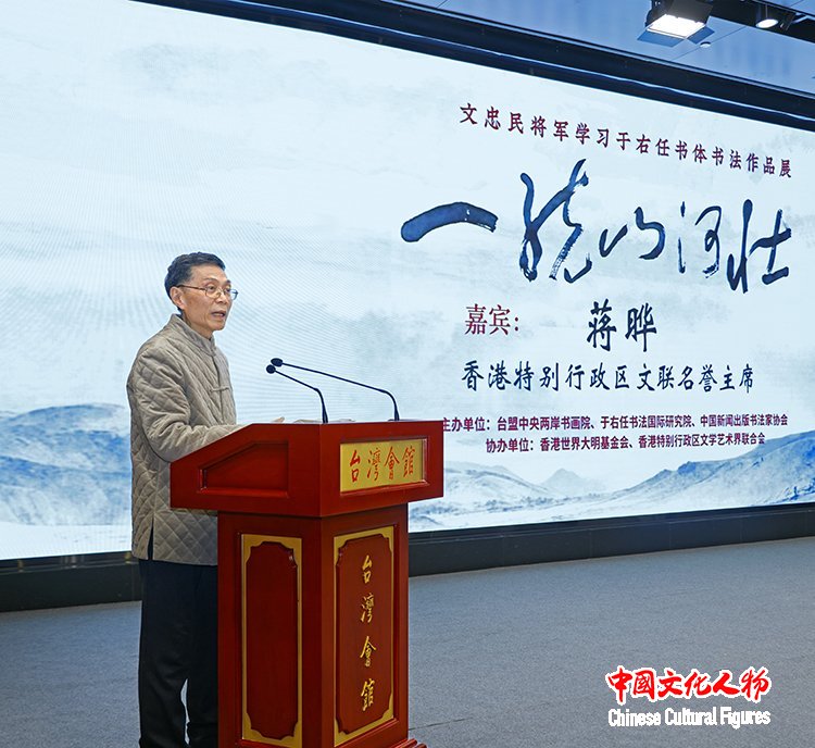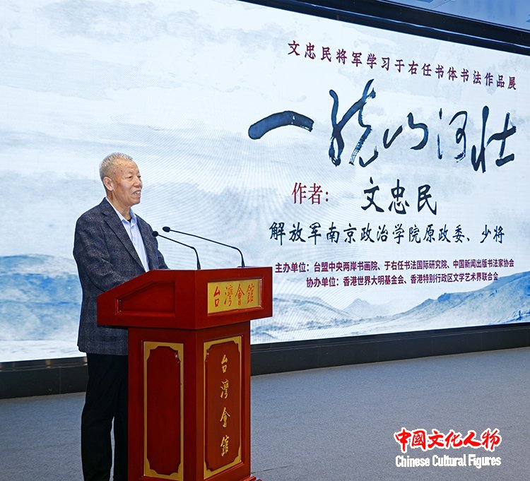 中国文化人物(记者 马将平 苏晴)笔墨传情寄初心,文脉相连聚同心。1月15日,由台盟中央两岸书画院、于右任国际书法研究会、中国新闻出版书法家协会联合主办,世界大明基金会(香港)、香港特别行政区文学艺术界联合会协办的“一统山河壮——文忠民将军学习于右任书体书法作品展”在北京台湾会馆隆重开幕。本次展览以文忠民将军研习近代书法巨匠于右任“标准草书”的艺术成果为核心,搭建起两岸文化艺术交流的桥梁,用笔墨丹青传承爱国情怀,诠释两岸同根同源的血脉羁绊。