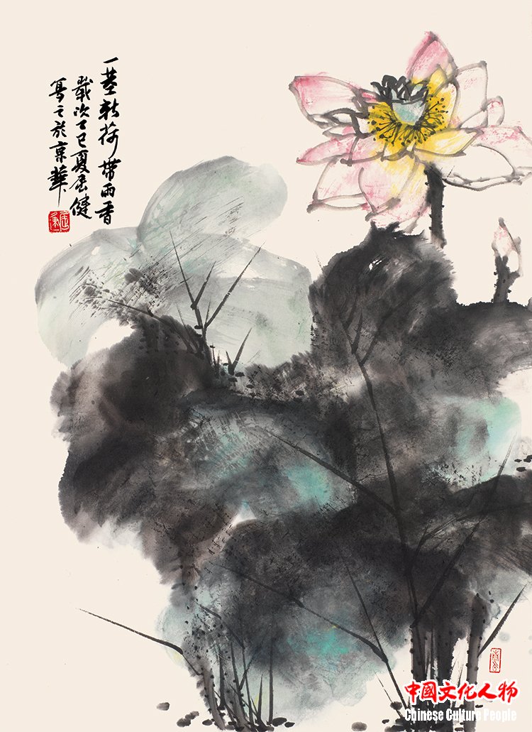 “A Single Fresh Lotus Stalk Carries the Fragrance after Rain” (69×47cm) by Qu Jian in 2025
