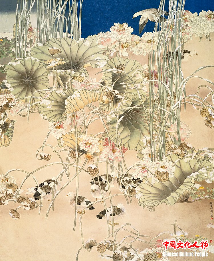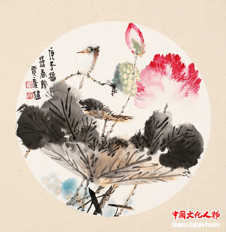 Jia Guangjian has in-depth research on the traditions of freehand flower-and-bird and mogu paintings of the Ming and Qing dynasties. He has especially absorbed the essence of two schools of painting: the Qingteng Baiyang (meaning “Blue Vine and White Sun”), represented by Xu Wei and Chen Chun, and the Wumen. By combining traditional composition with modern structure, the lotus joints, autumn melons, red flowers, and ink leaves in his works all exude vitality and a fresh, agile atmosphere.
