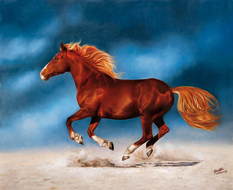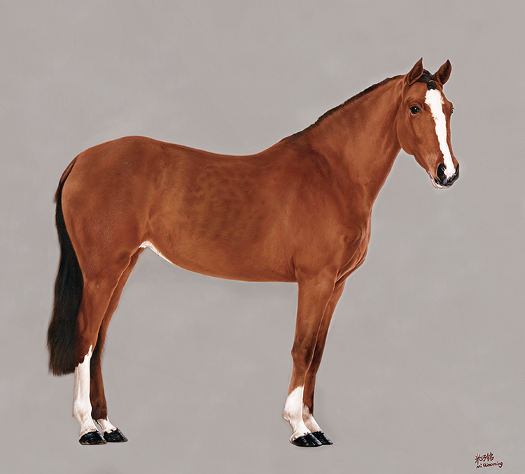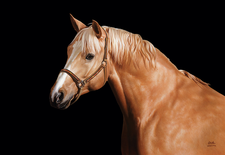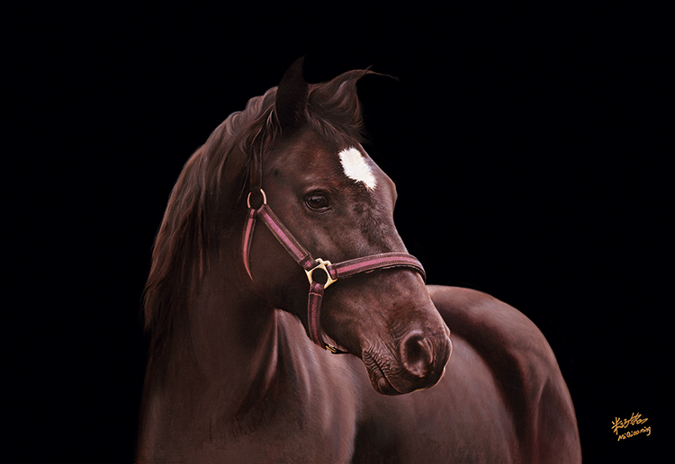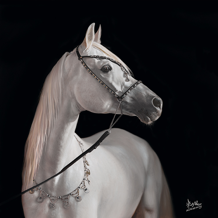 在“马”系列作品中,米巧铭将超写实的马儿描绘得深刻细腻,展现了她对东方韵味与西方技法的巧妙结合,这些马或侧身回眸或垂首沉思或凝视前方,形态各异,刻画得极为逼真,马面上细腻的鬃毛,凸起的青筋以及脖颈上强韧的线条,有质感的肌理,凸显了画家深厚的造型能力及敏锐的感知力。米巧铭以饱含传统意蕴的画笔描摹出马的各种生动传神的眼神,或惊奇或淡然或坚定,充满灵韵和生命的力量。