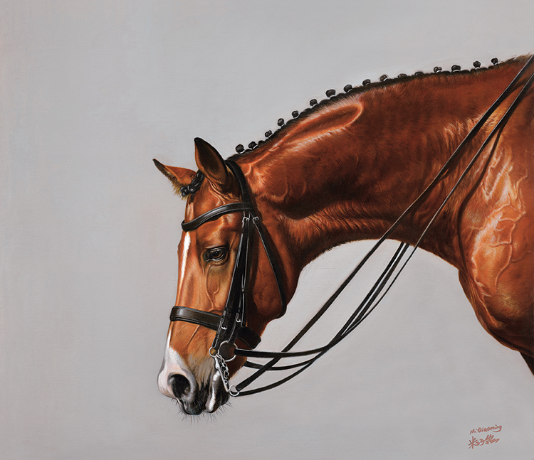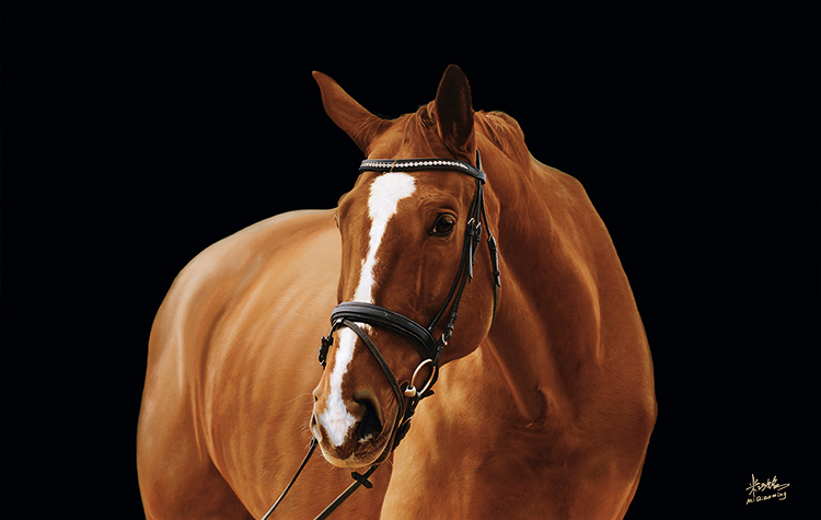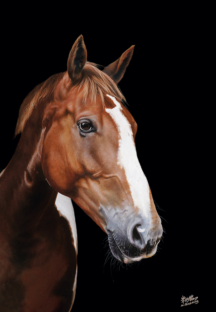 有评论家这样说:米巧铭的“马”系列虽采用了西方的写实绘画形式,依然可看出她对东方气质和神韵的融入,这种融入体现在她对眼睛的刻画。源自早年对传统中国画的学习积累,米巧铭以饱含传统意蕴的用笔,细腻地描摹出马的各种生动传神的眼神,或惊奇,或淡然,或坚定,充满灵韵和生命的力量。观者被这灵韵所吸引,凝视着马的眼神,禁不住生出“鲜衣怒马,烈焰繁花”的联想和感叹。这是画家对马儿赋予了自己的内心情感,这种情感来自生活的丰富体验,借由画笔将中国传统的写意精神有机地融入西方写实绘画中,表达出画家心中灵动的激情,产生了一种多彩的艺术效果。