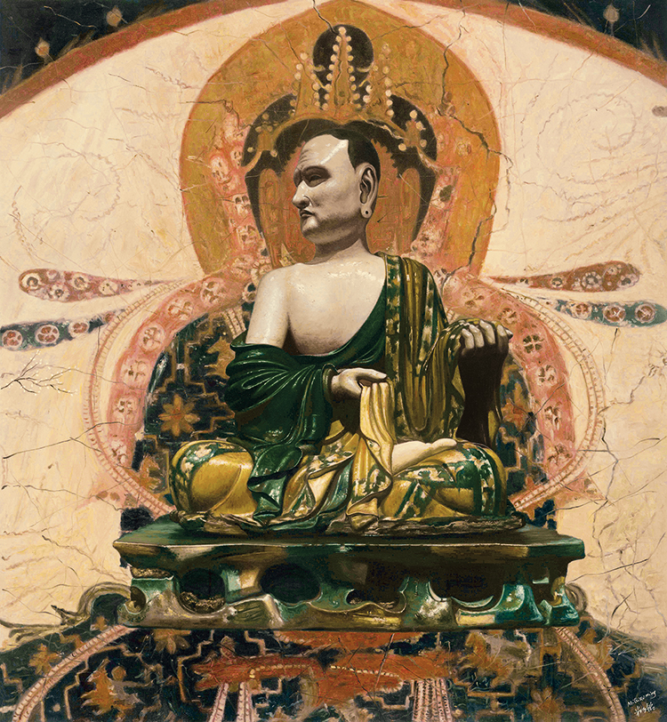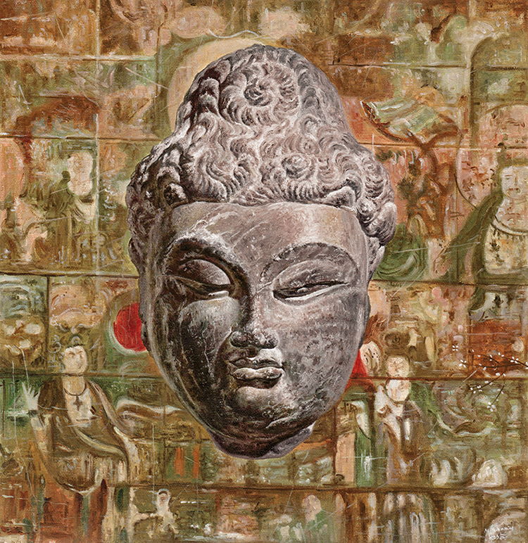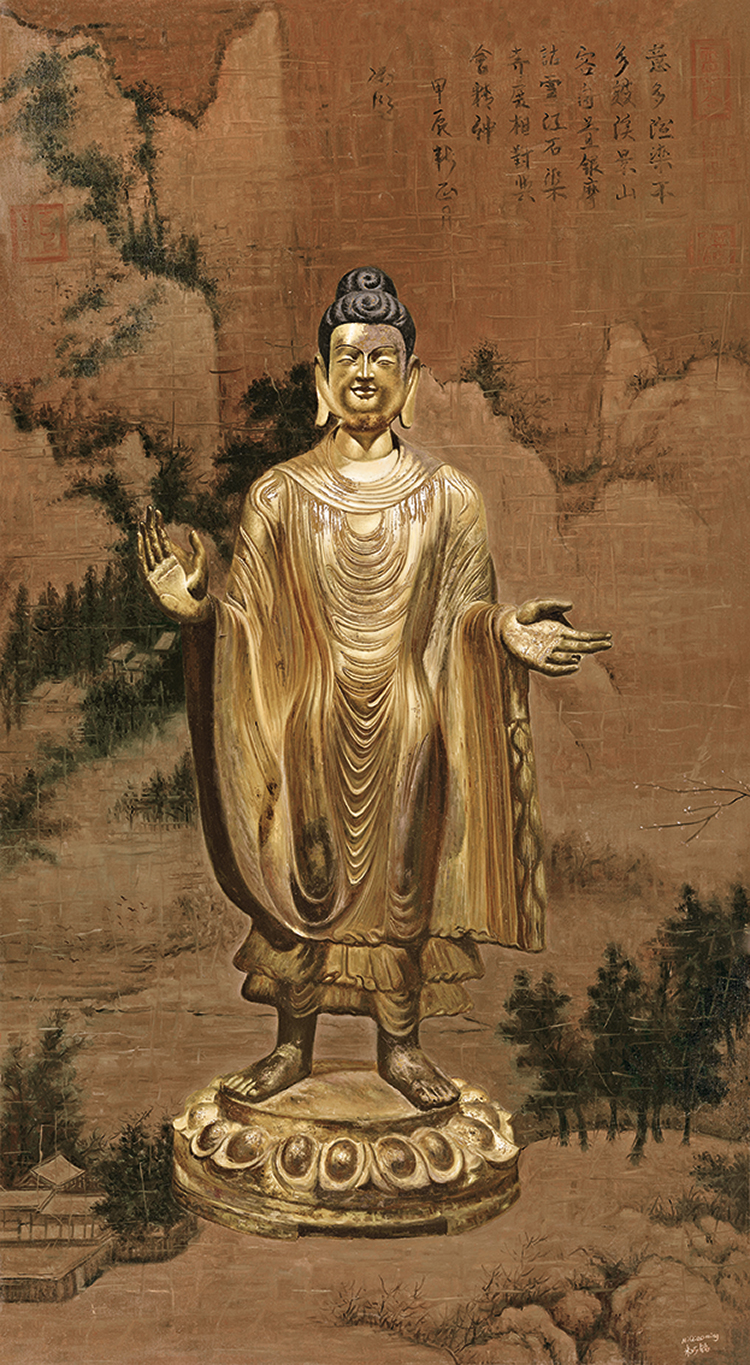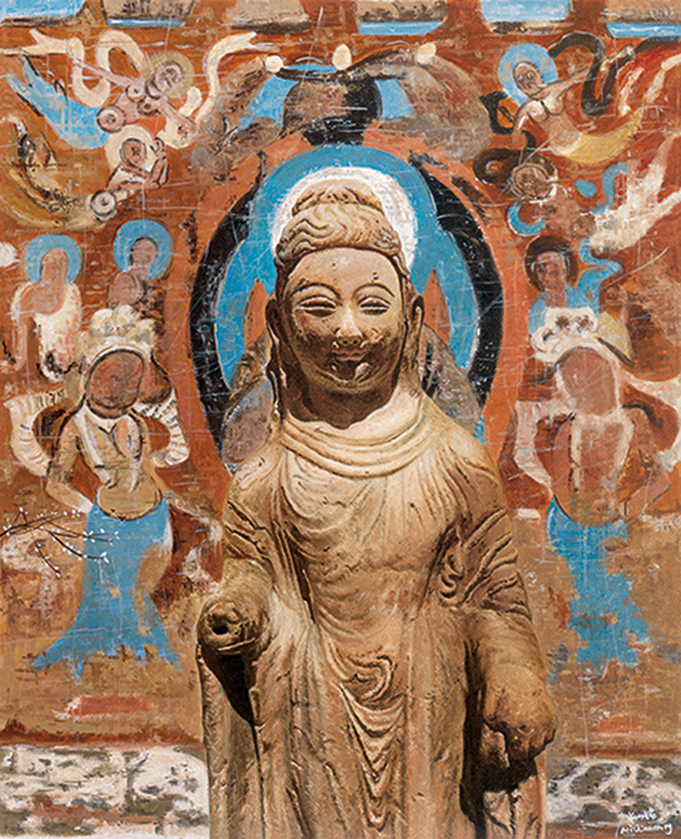 占据画面最大面积的是中国历代名画或者画作的局部。经过油画的诠释,画面给人一种熟悉的陌生感。但是,巧铭没有画得很实,而是注重画面的气氛和调子。这些作为背景的古画,给人一种渐行渐远的感觉,就像“过去”,逐渐退为人生的背景。但是,佛像的处理方式完全不同,画得非常坚实、细腻,甚至有点超级写实的意味,与佛像题材刚好吻合。巧铭画的佛像,不是她自己创作的佛像,而是现成的佛像雕塑,就像她画的背景山水,不是她创作的山水,而是山水画。山水画重气氛和意境,可以画得较虚;雕塑本身就是三维,适合画得较实。但是,我看重的还不只是题材与语言的配合,而是寓意与语言的配合。如果说作为背景的山水画象征对“过去”的追忆,作为主题的佛像雕塑又象征什么呢?诚然,这些佛像雕塑也是过去时代的产物,就像那些作为背景的绘画作品一样。但是,如果我们将佛像作为信仰对象来看的话,它们就永远不会过去。佛不仅不会过去,而且始终作为理想存在于“未来”的时间维度之中。尽管“未来”与“过去”一样,都不是我们直接经验的时间维度,但是它们给我们的印象全然不同:“未来”总是清晰的,“过去”总是模糊的。这不仅因为时间是由“过去”向“未来”推移,“未来”变得越来越清晰,“过去”变得越来越模糊,更重要的是“未来”是憧憬的理想,“过去”是已逝的追忆。“过去”是业已存在者留下的痕迹,它们或深或浅,或明或暗。但是,“未来”不同。作为尚未实现的理想,“未来”是没有区别的完满。巧铭将佛像画得很实,将国画画得很虚,不仅与题材有关,而且与它们唤起的时间感有关。