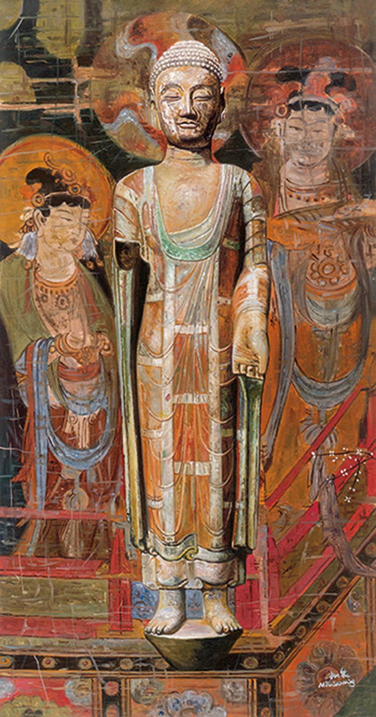 米巧铭的“梵韵吉相”佛像系列油画作品同样别具一格。她以西方油画的表现手法描绘东方佛禅文化,将佛像的庄严与西方油画的写实风格完美结合。在作品中,她注重佛像的细节刻画,金属质感的表现栩栩如生,展现出她扎实的绘画功底。她选取中国传统的古画、壁画作为背景,用油画技法皴擦晕染,营造出浓厚的历史氛围和文化底蕴。画面中点缀的桃花或木棉花,为作品增添了一抹生机与灵动,使整个画面在庄重与活泼之间达到了奇妙的平衡。