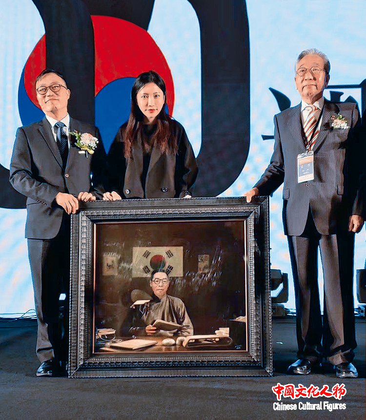 2019年,在韩国建国百年纪念仪式上韩国新任驻华大使张夏成、韩国驻上海总领事崔永杉及金九先生的长孙共同接受了米巧铭作为国礼的油画作品《金九在上海,1932》并合影留念