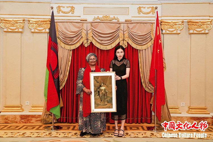 2016年,马拉维第一任女总乔伊斯·班达统收藏米巧铭作品并合影留念