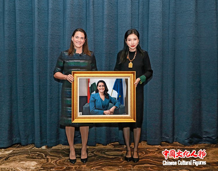 2023年,哥斯达黎加第一任女总统劳拉·钦奇利亚·米兰达收藏米巧铭作品并合影留念
