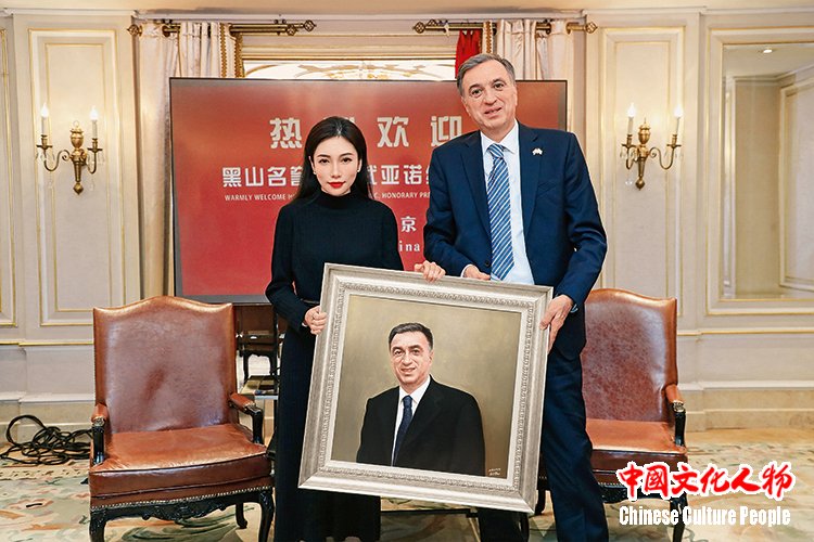 2023年,黑山第一任总统菲利普·武亚诺维奇收藏米巧铭作品并合影留念