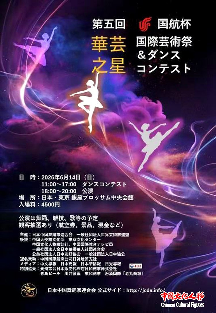 中国文化人物(记者 苏晴)由日本中国舞蹈家联合会、一般社团法人世界艺术家联盟主办,中国驻日本大使馆文化处、中国文化人物杂志社、东京文化中心、中国国际教育电视台、一般社团法人全日本华侨华人社团联合会、公益社团法人日中友好协会、一般社团法人日中协会、株式会社ファイアグローバル支持的第五届华艺之星国际艺术节暨国际舞蹈大赛将于2026年6月14日在日本东京银座ブロッサム中央会馆举办。